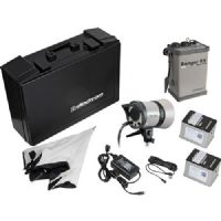 This is an Elinchrom Ranger RX Speed 1100W/s strobe lighting kit. The "RX" signifies the ability to be fired by a remote control handset, or computer. The "AS" indicates the power pack's ability to divide the power asymmetrically between two attached Freelite flash heads. The power selection range is 7.5 f-stops. Lower the power to 7.5W/s, switch to slow recycle, and up to 5,100 exposures can be made.